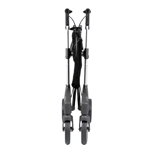 Hopfällningen kan enkelt manövreras med en hand vilket gör rollatorn praktisk att transportera. Den står stadigt på hjulen och tar upp lite plats när den förvaras.
